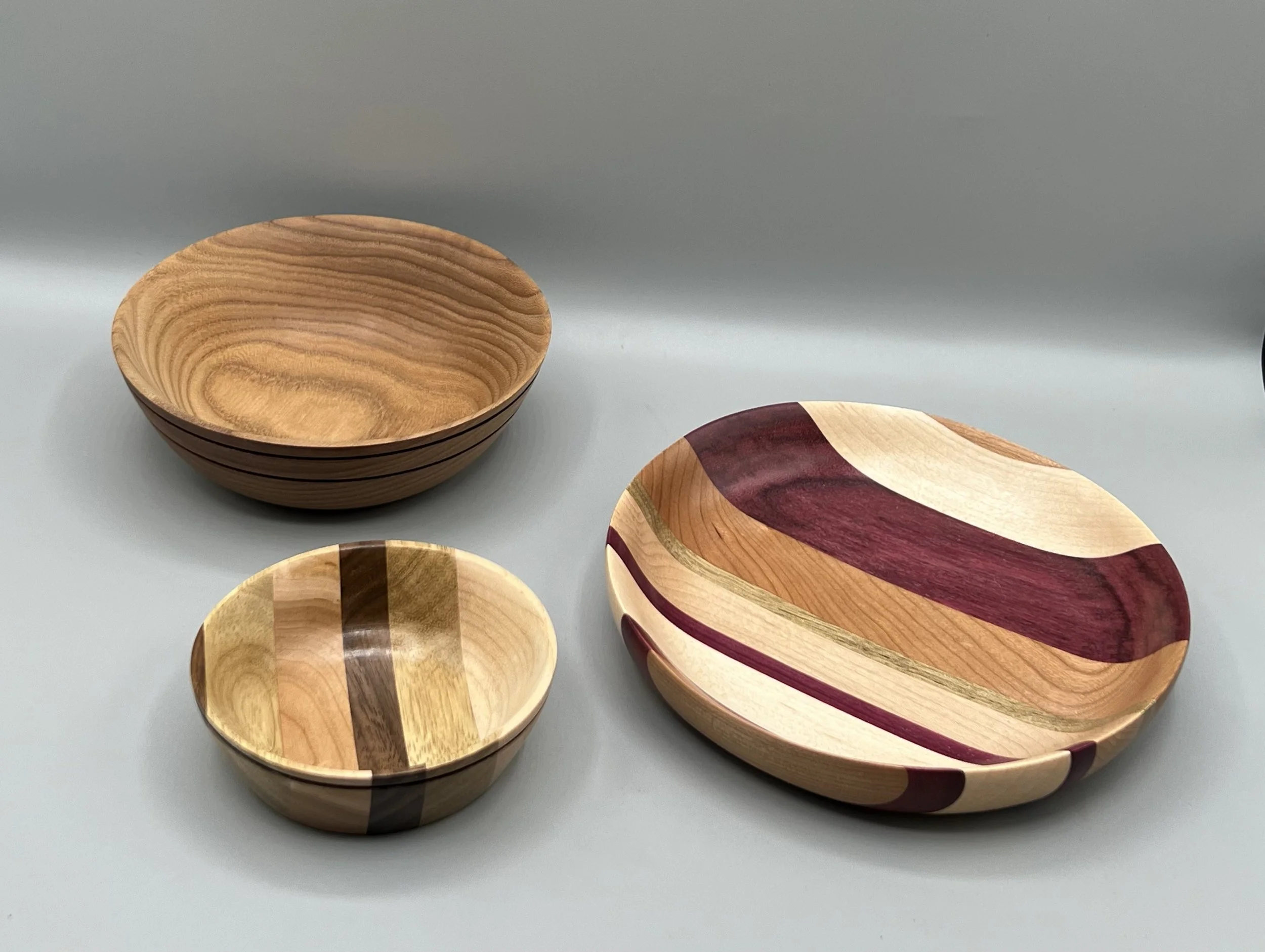 We start with rough cut lumber, usually 8/4 or 6/4 and create from there. These stacks have Wenge, Zebra wood, Padauk, Purple Heart, Hard Maple, American Cherry, Black Walnut and Walnut. A lot of work in our future.